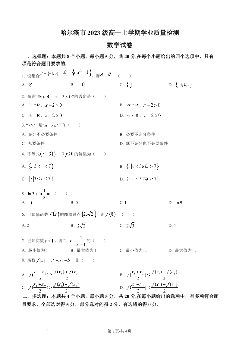 黑龙江省哈尔滨市2023-2024学年高一上学期1月期末测试数学(原卷版)