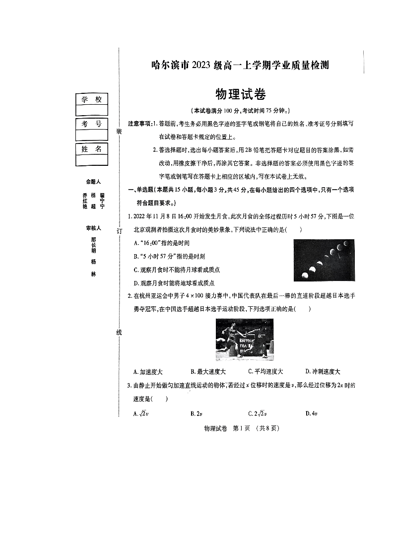 黑龙江省哈尔滨市2023-2024学年高一上学期1月期末测试物理+答案