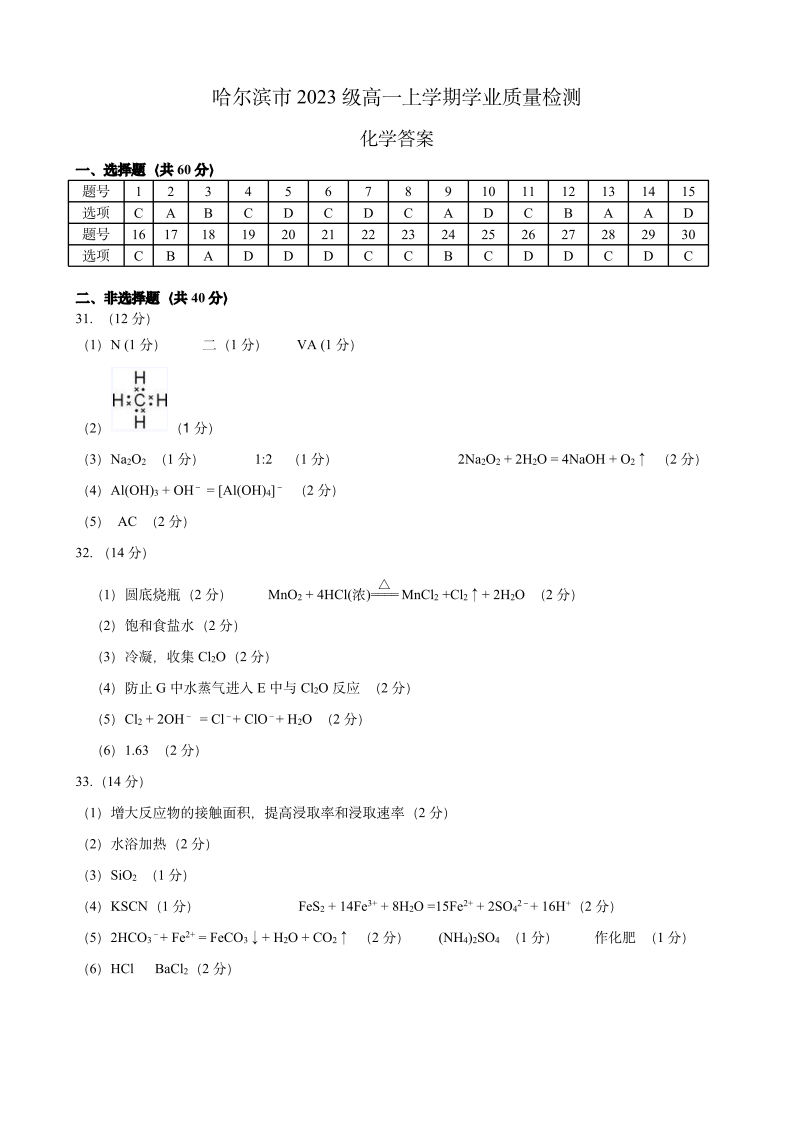 黑龙江省哈尔滨市2023-2024学年高一上学期1月期末测试化学答案
