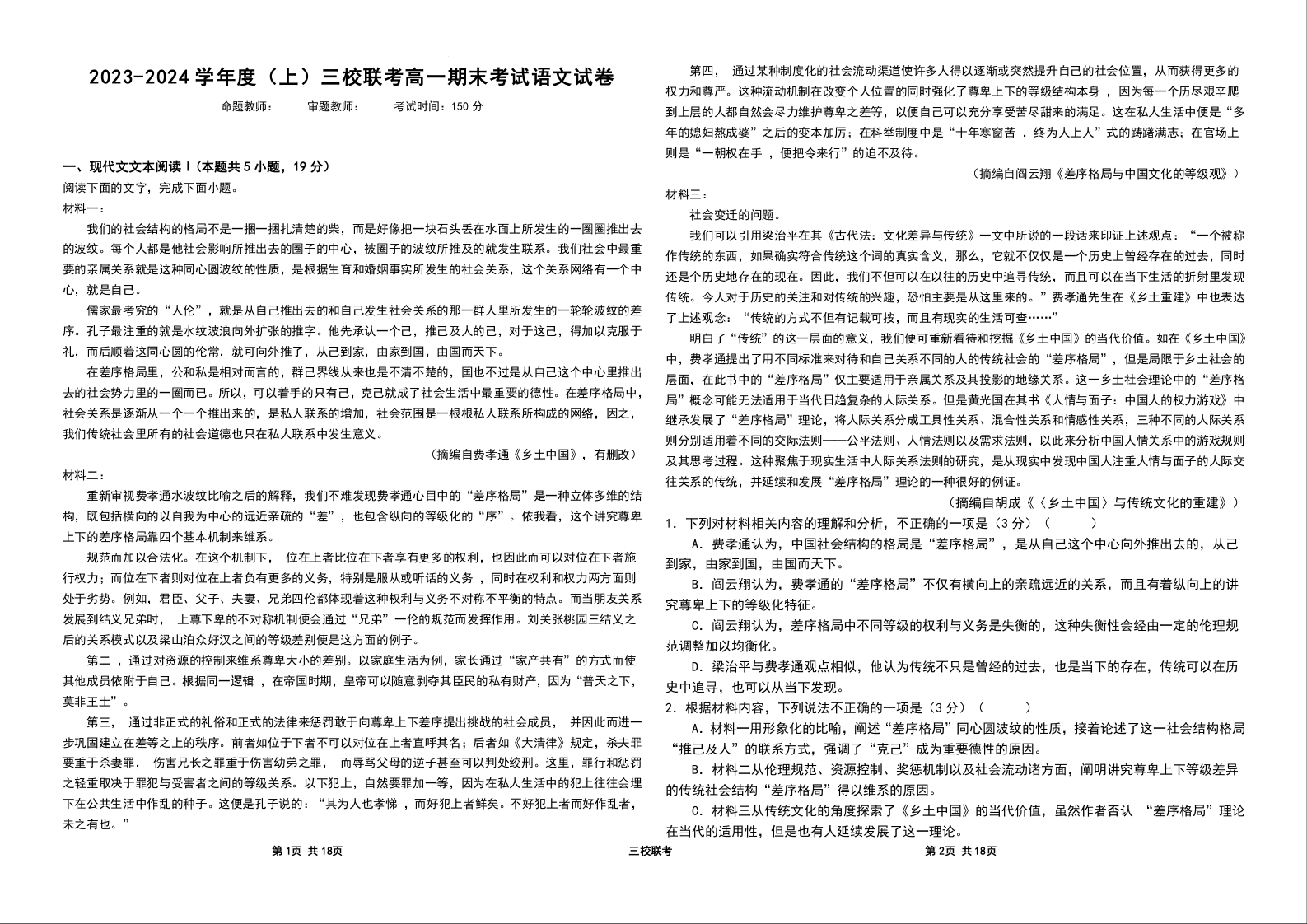 黑龙江省佳木斯市三校联考2023-2024学年高一上学期1月期末考试语文+答案