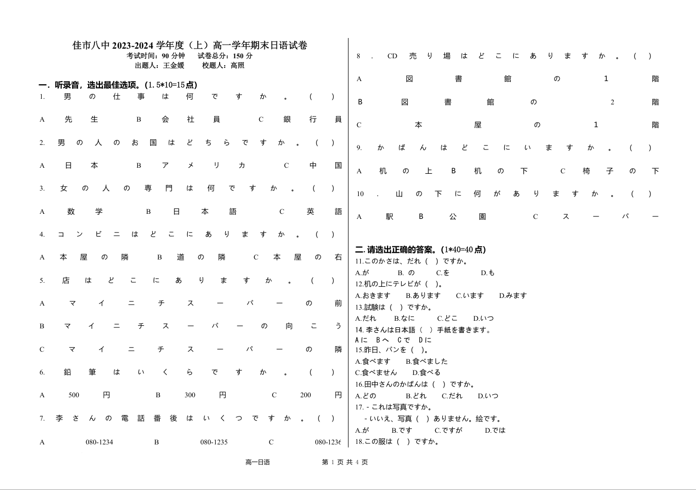 黑龙江省佳木斯市三校联考2023-2024学年高一上学期1月期末考试日语