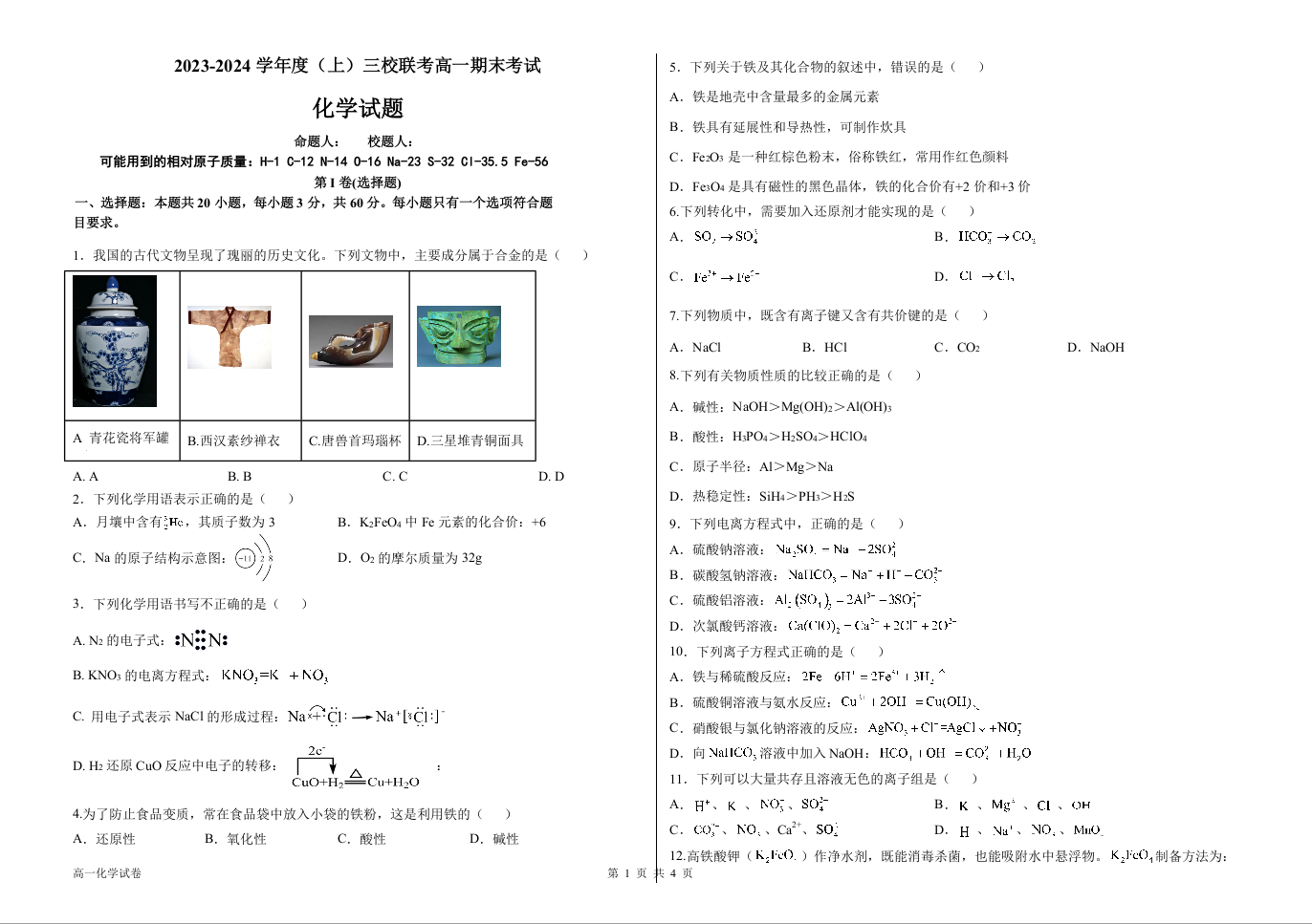 黑龙江省佳木斯市三校联考2023-2024学年高一上学期1月期末考试化学+答案