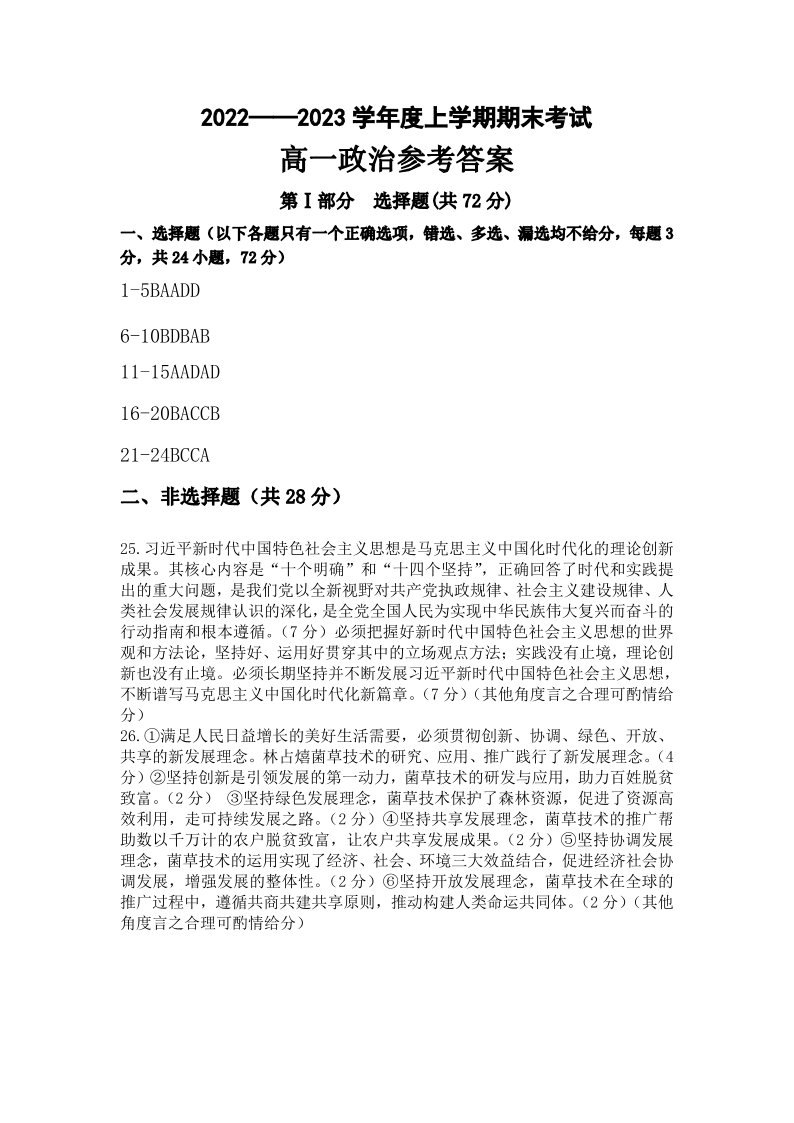 黑龙江省齐齐哈尔市第八中学校2022-2023学年高一上学期1月期末考试政治答案