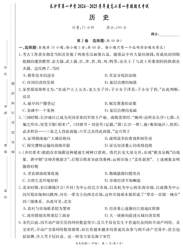 湖南省长沙市第一中学2024-2025学年上学期高二期末考试历史+答案