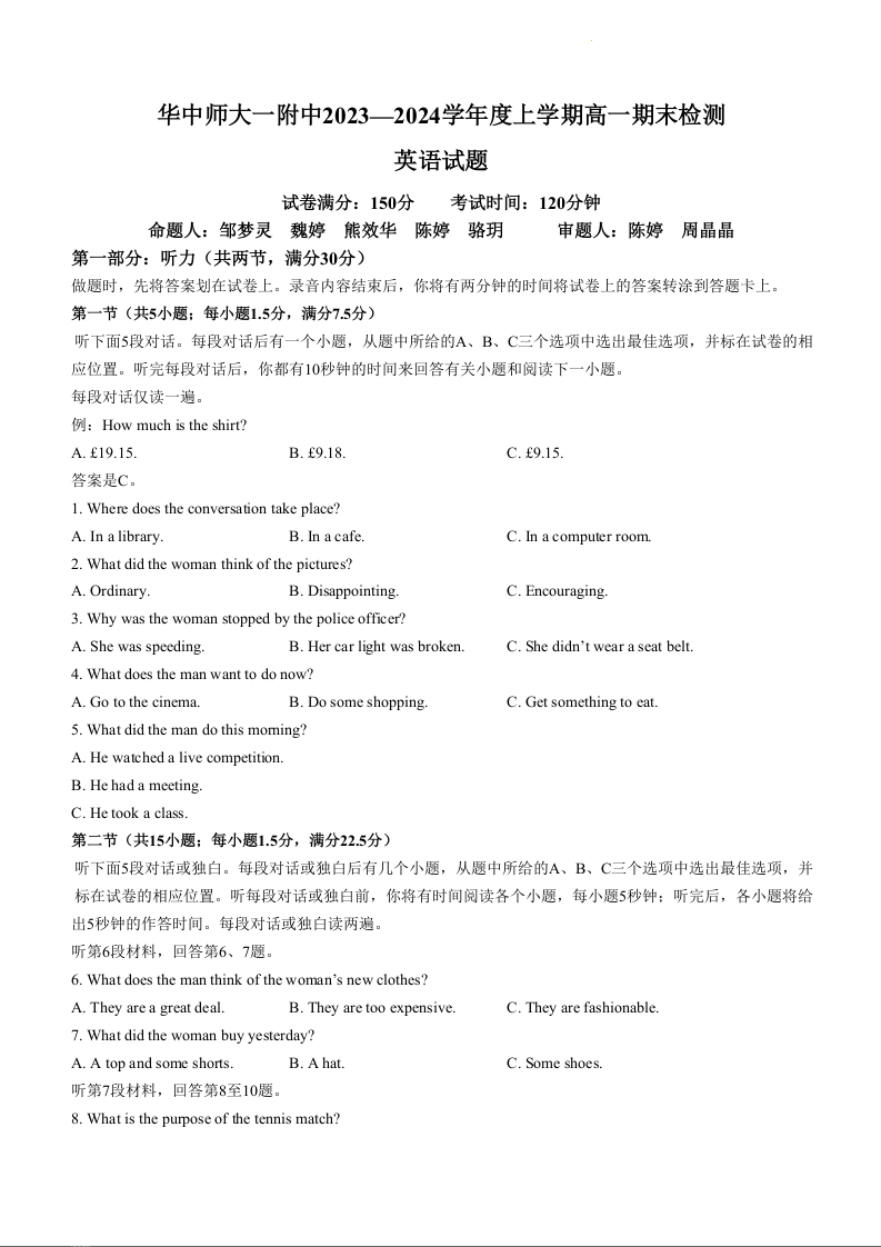 湖北省武汉市华中师范大学第一附属中学2023-2024学年高一上学期1月期末检测英语