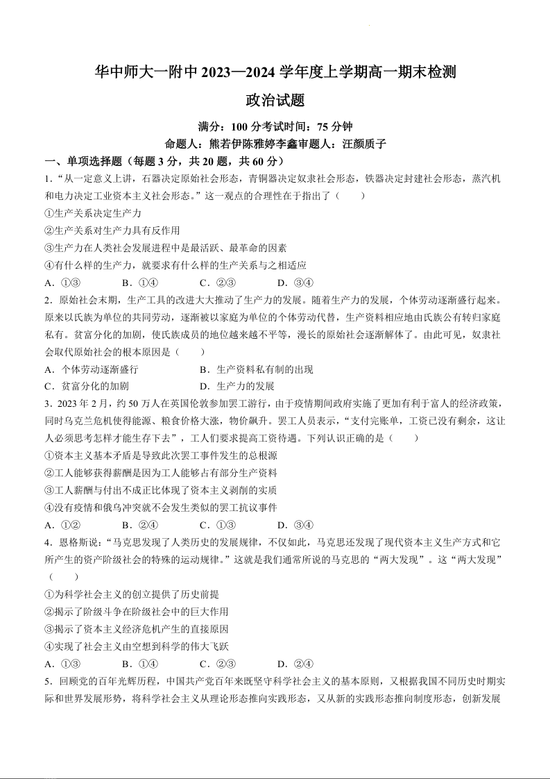 湖北省武汉市华中师范大学第一附属中学2023-2024学年高一上学期1月期末检测政治