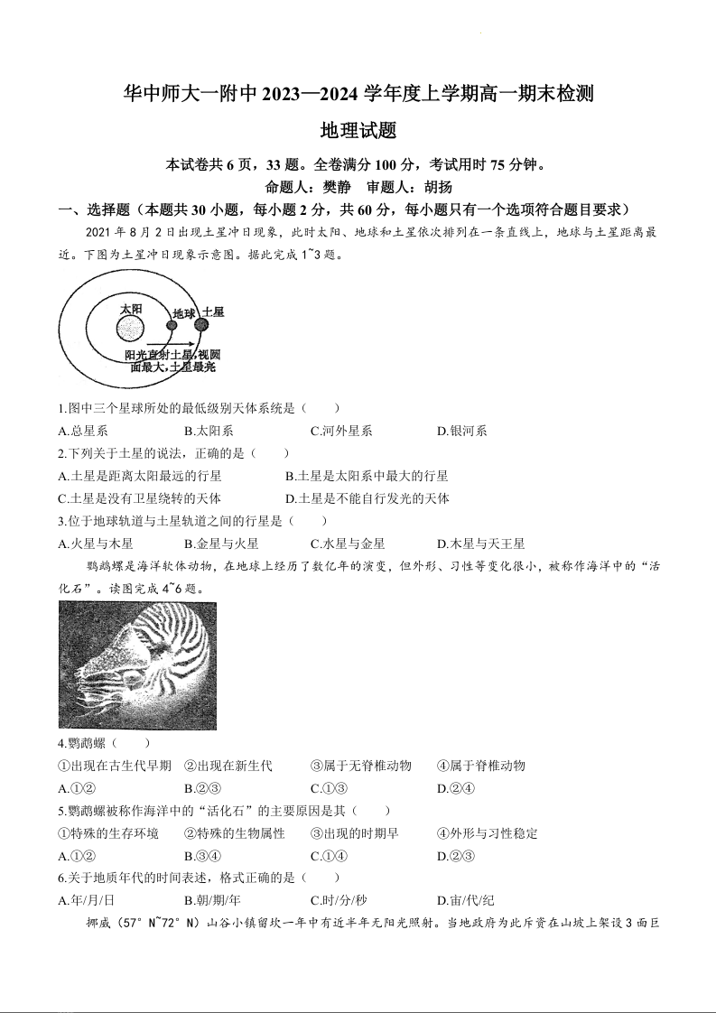湖北省武汉市华中师范大学第一附属中学2023-2024学年高一上学期1月期末检测地理