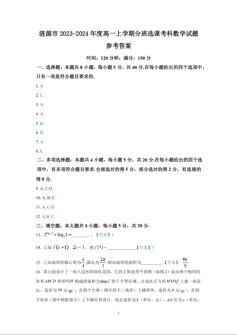 湖南省娄底市涟源市2023-2024学年高一上学期1月期末分班选科考试数学答案