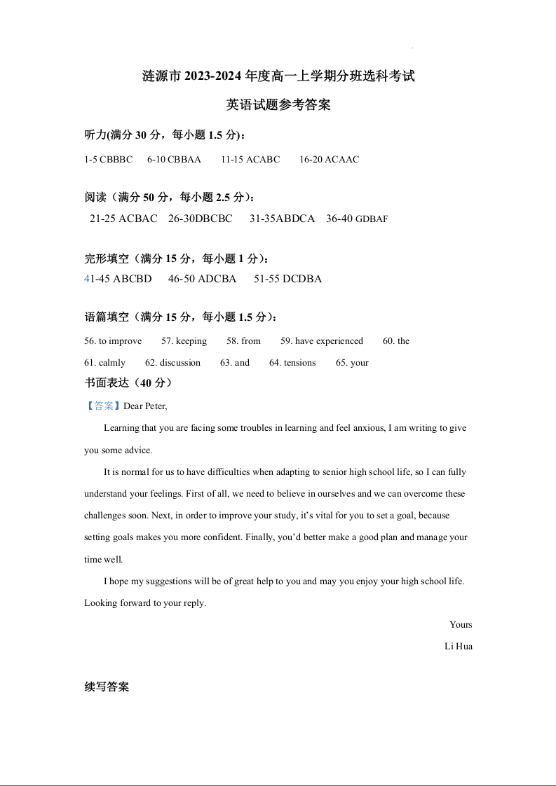 湖南省娄底市涟源市2023-2024学年高一上学期1月期末分班选科考试英语答案