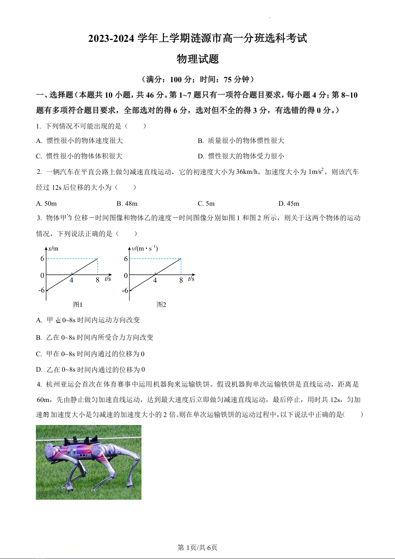 湖南省娄底市涟源市2023-2024学年高一上学期1月期末分班选科考试物理(原卷版)
