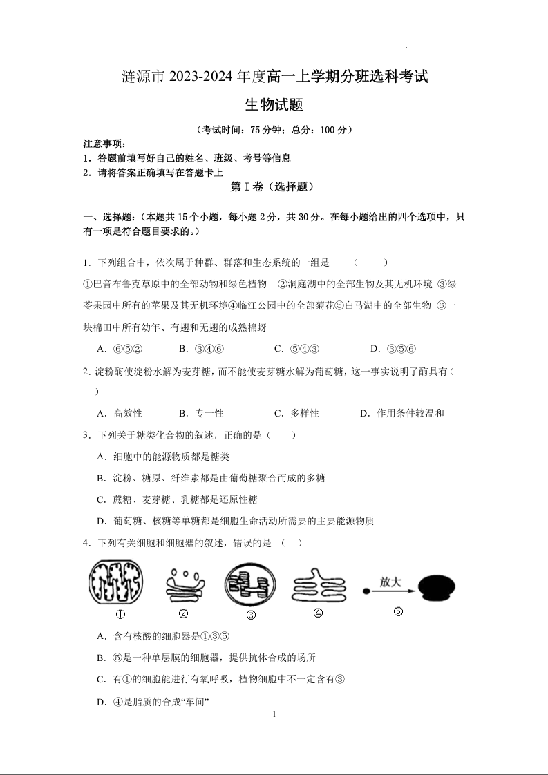 湖南省娄底市涟源市2023-2024学年高一上学期1月期末分班选科考试生物