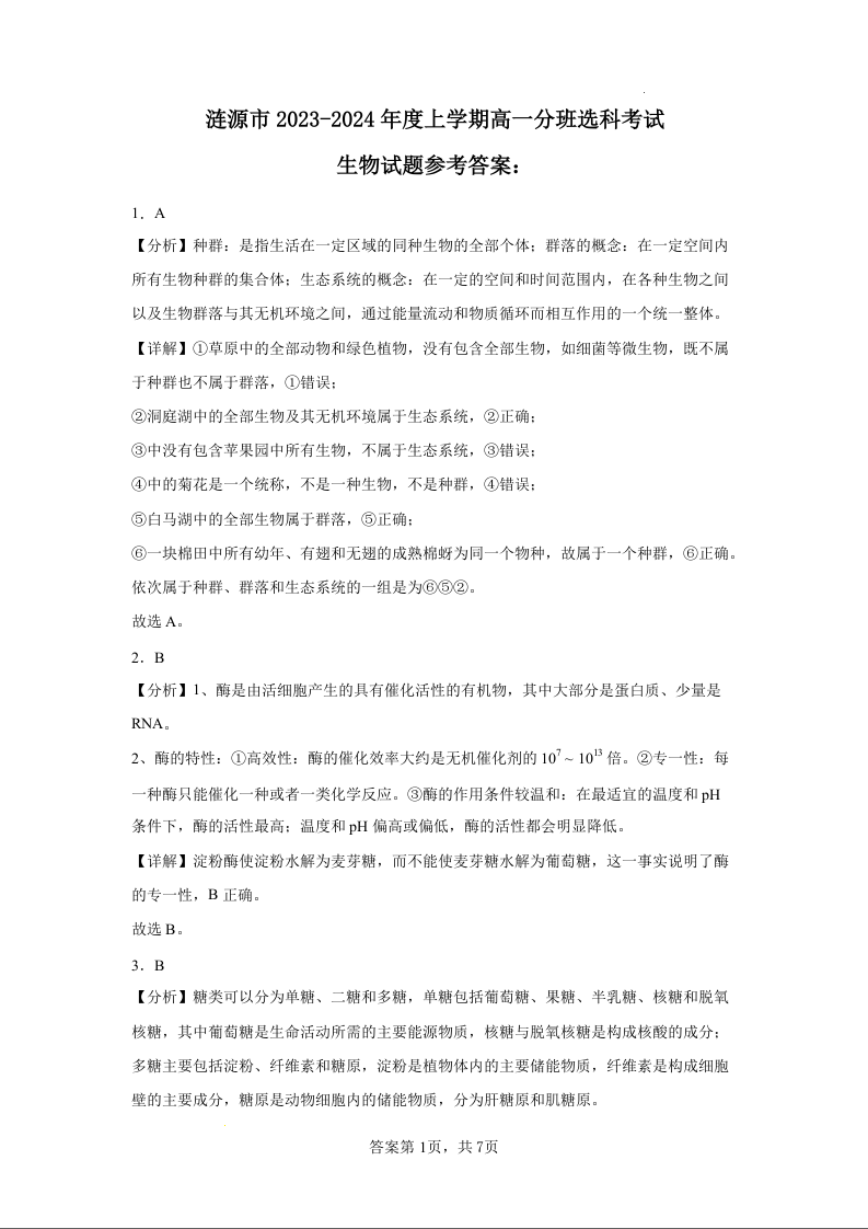湖南省娄底市涟源市2023-2024学年高一上学期1月期末分班选科考试生物答案