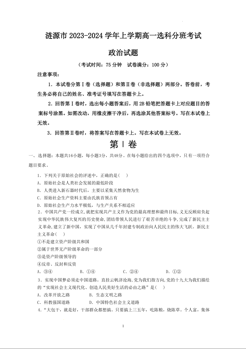 湖南省娄底市涟源市2023-2024学年高一上学期1月期末分班选科考试政治+答案