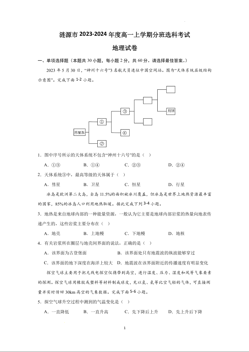 湖南省娄底市涟源市2023-2024学年高一上学期1月期末分班选科考试地理+答案