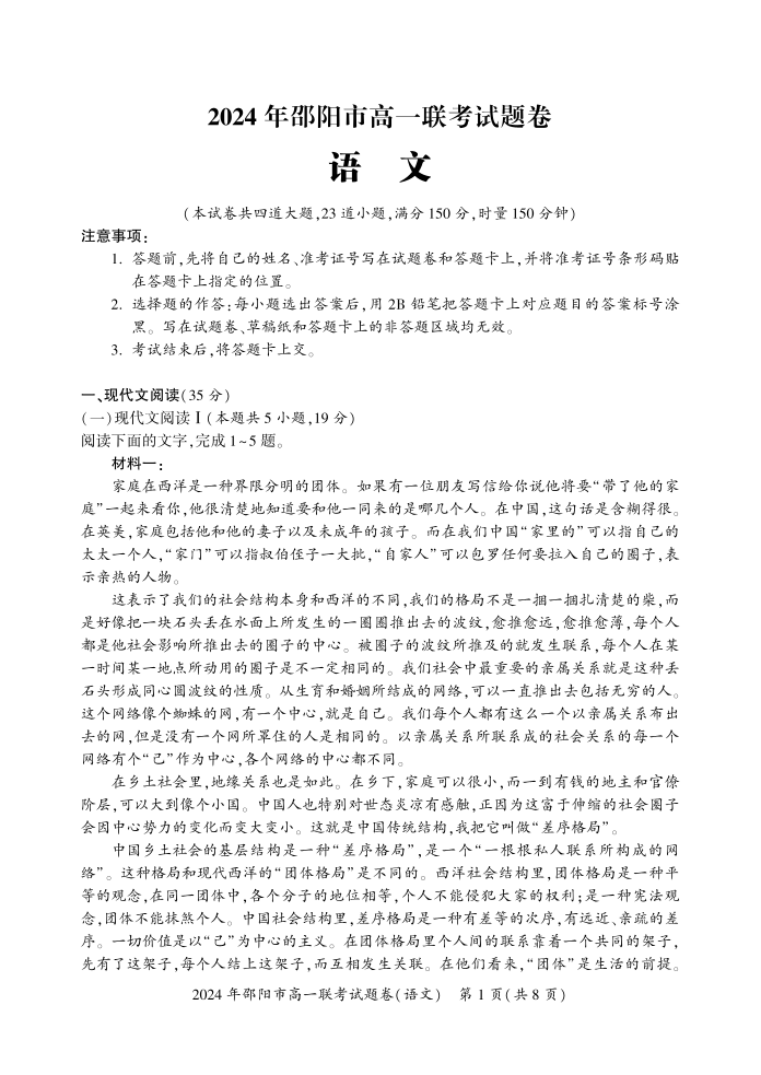 湖南省邵阳市2023-2024学年高一上学期1月期末联考语文