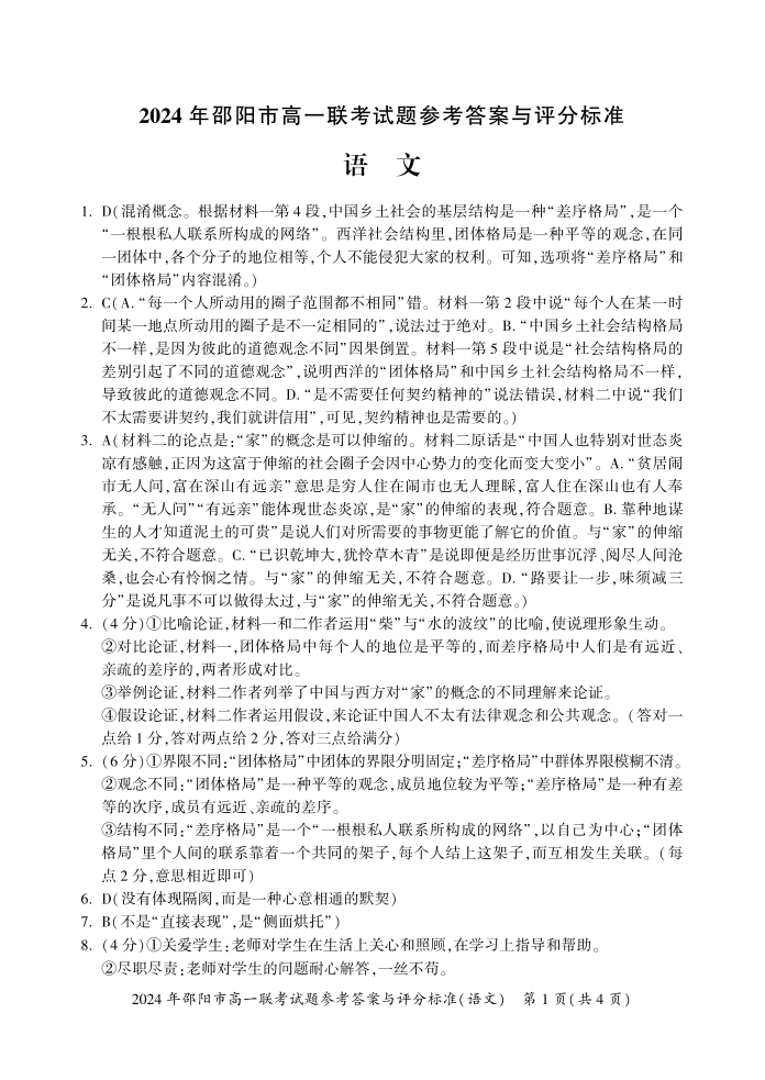 湖南省邵阳市2023-2024学年高一上学期1月期末联考语文答案