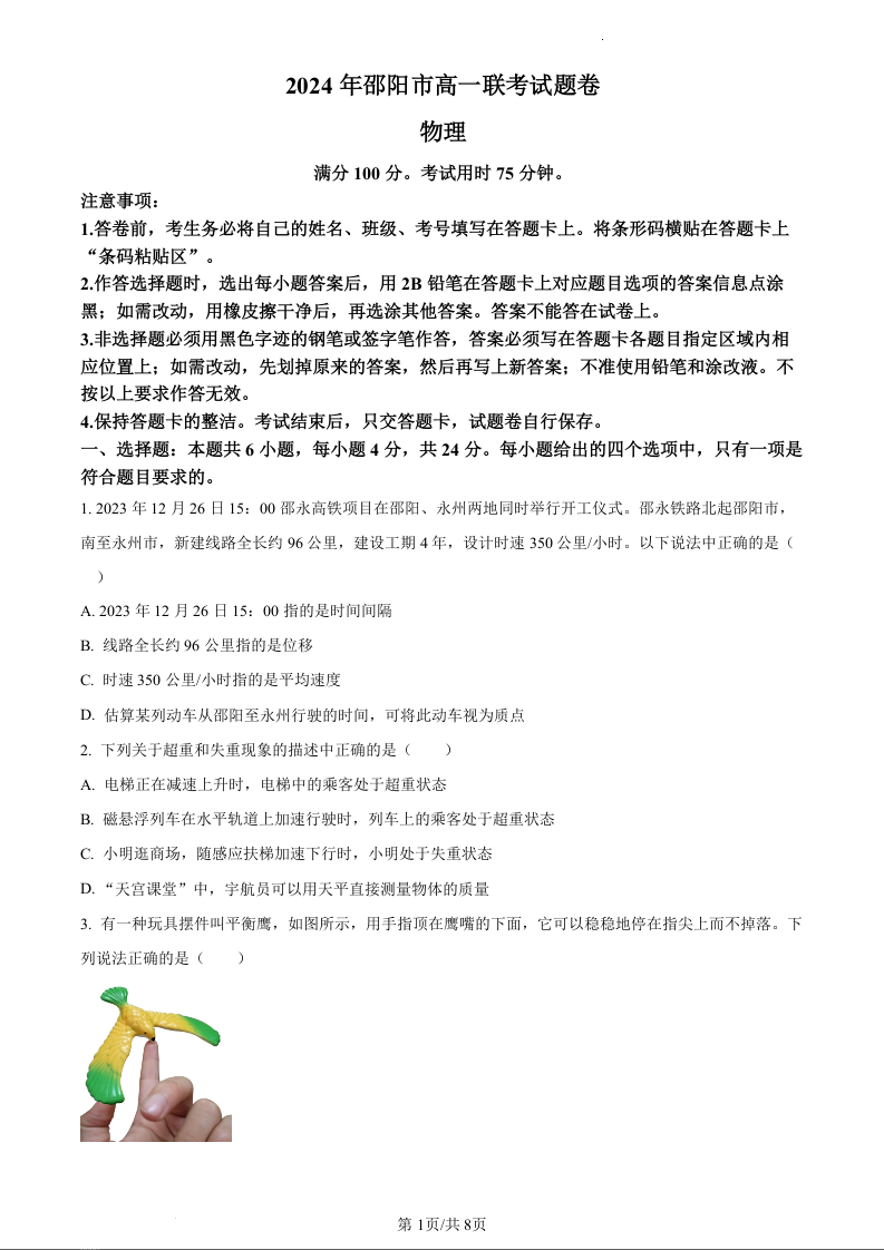 湖南省邵阳市2023-2024学年高一上学期1月期末联考物理+答案