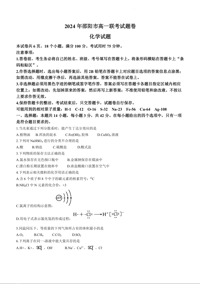 湖南省邵阳市2023-2024学年高一上学期1月期末联考化学