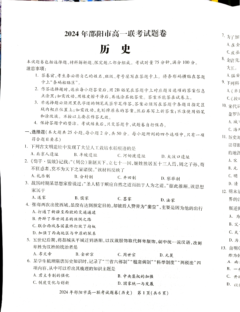 湖南省邵阳市2023-2024学年高一上学期期末考试历史试题