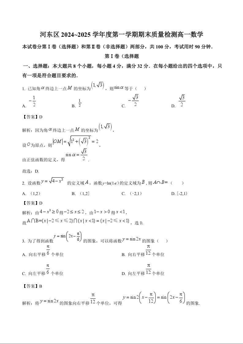 天津市河东区2024-2025学年上学期高一期末质量检测数学(解析版)