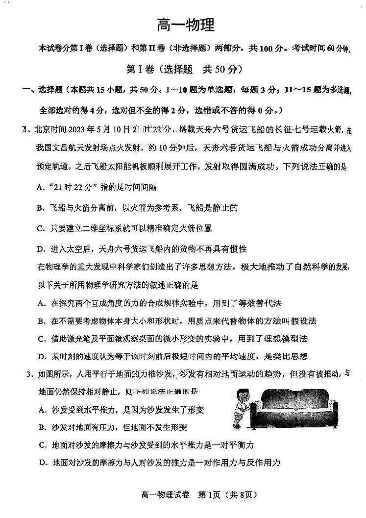 天津市河东区2024-2025学年上学期高一期末质量检测物理+答案