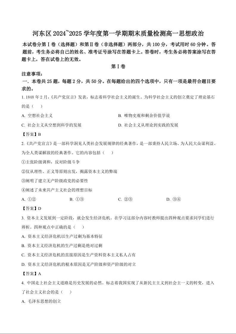 天津市河东区2024-2025学年上学期高一期末质量检测政治(解析版)