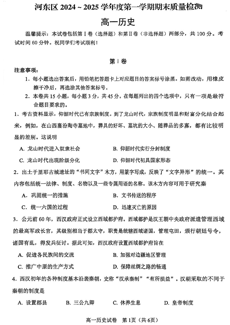 天津市河东区2024-2025学年上学期高一期末质量检测历史+答案
