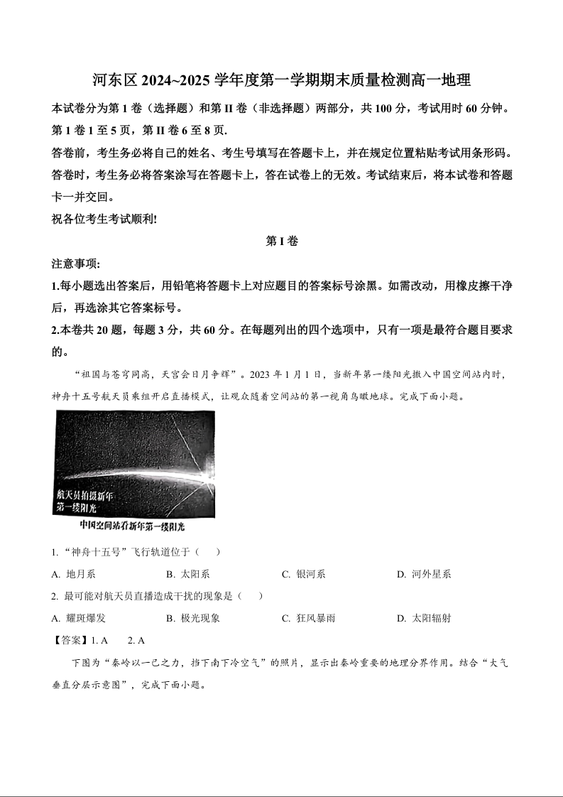 天津市河东区2024-2025学年上学期高一期末质量检测地理(解析版)