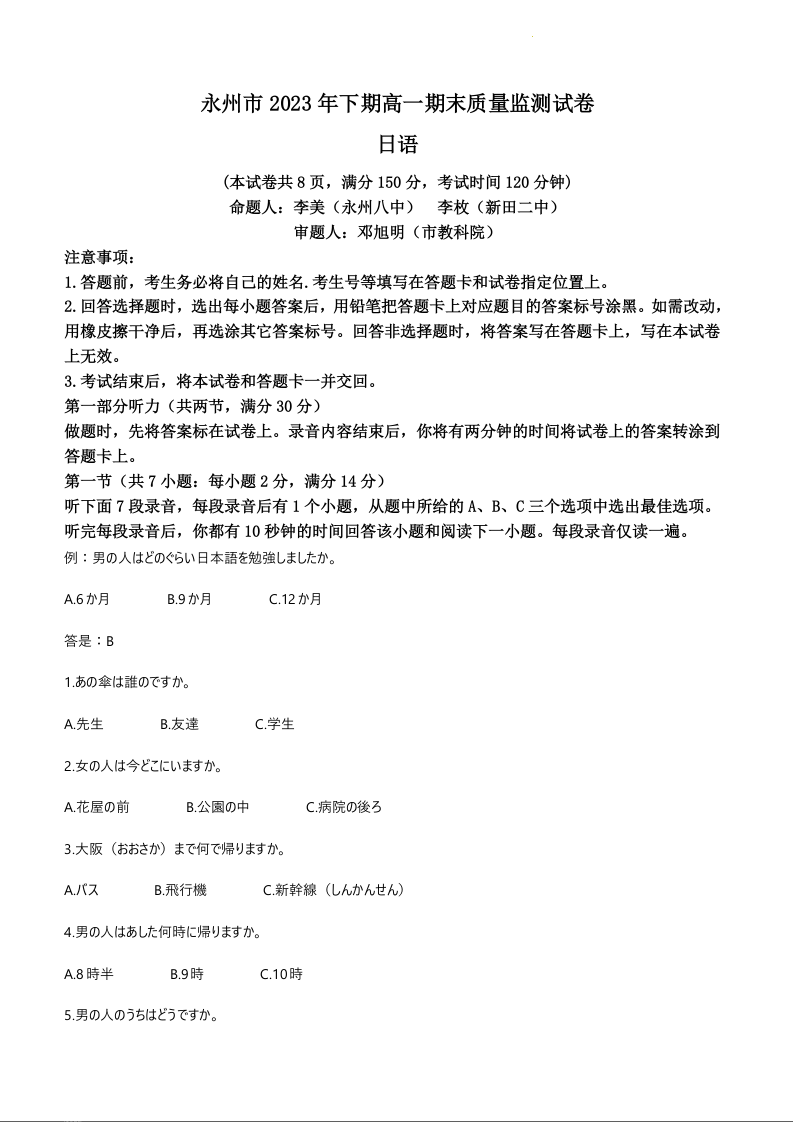湖南省永州市2023-2024学年高一上学期期末考试日语