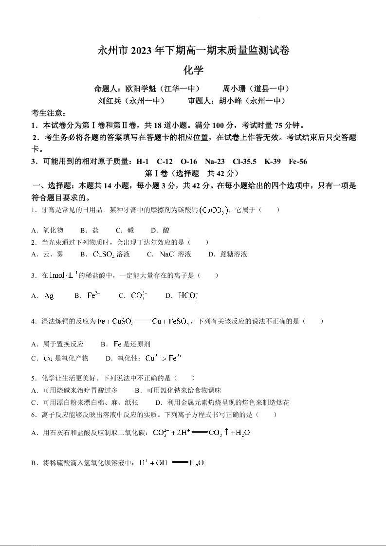 湖南省永州市2023-2024学年高一上学期期末考试化学+答案
