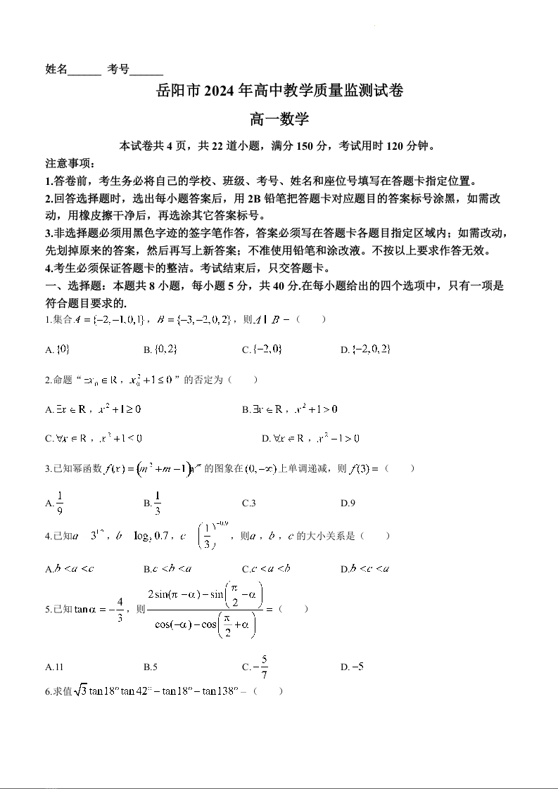 湖南省岳阳市2023-2024学年高一上学期1月期末试题数学+答案