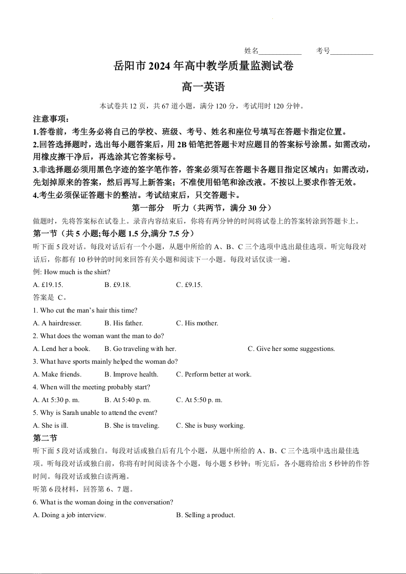 湖南省岳阳市2023-2024学年高一上学期1月期末试题英语