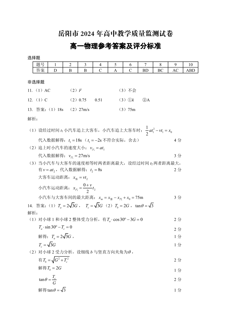 湖南省岳阳市2023-2024学年高一上学期1月期末试题物理答案