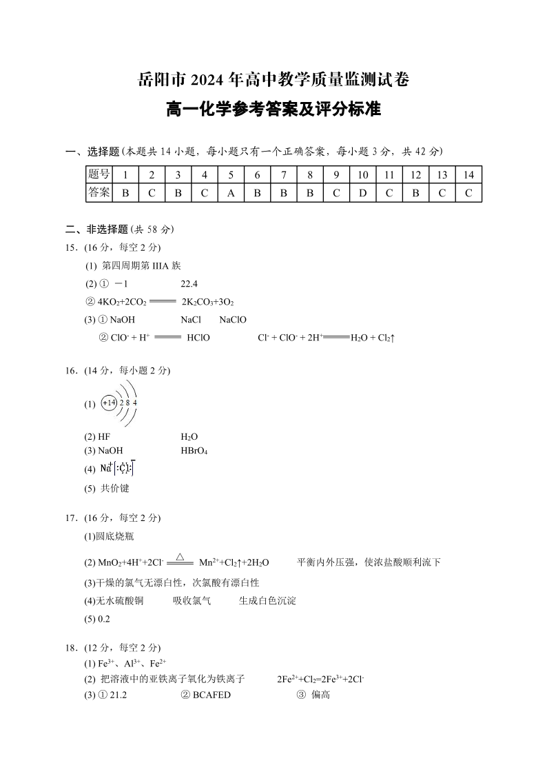 湖南省岳阳市2023-2024学年高一上学期1月期末试题化学答案