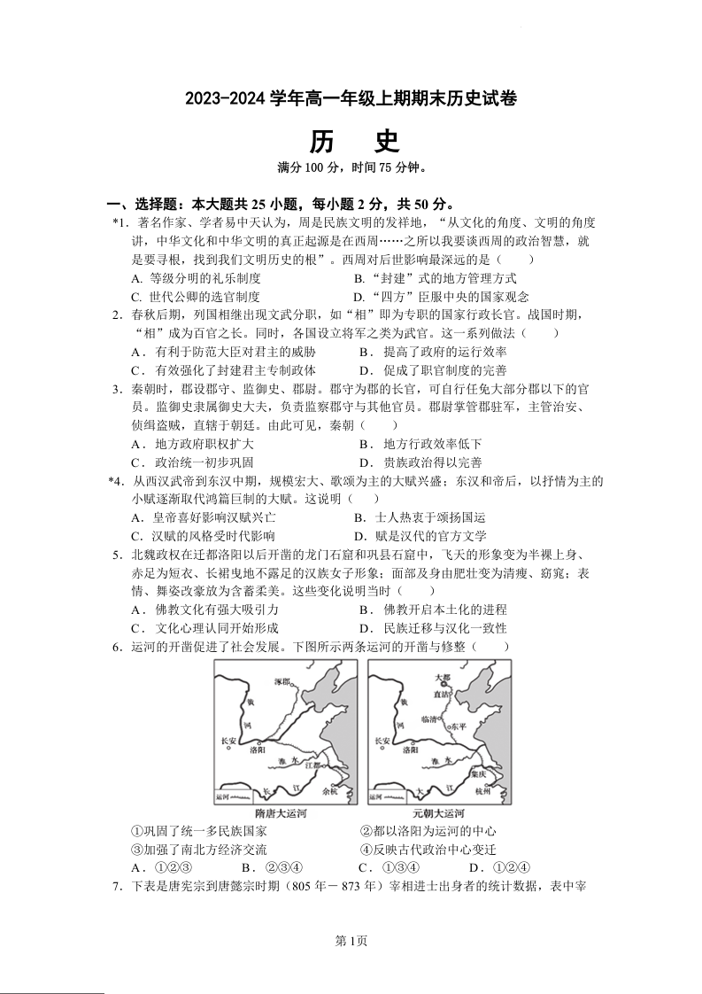 湖南省岳阳市2023-2024学年高一上学期1月期末试题历史