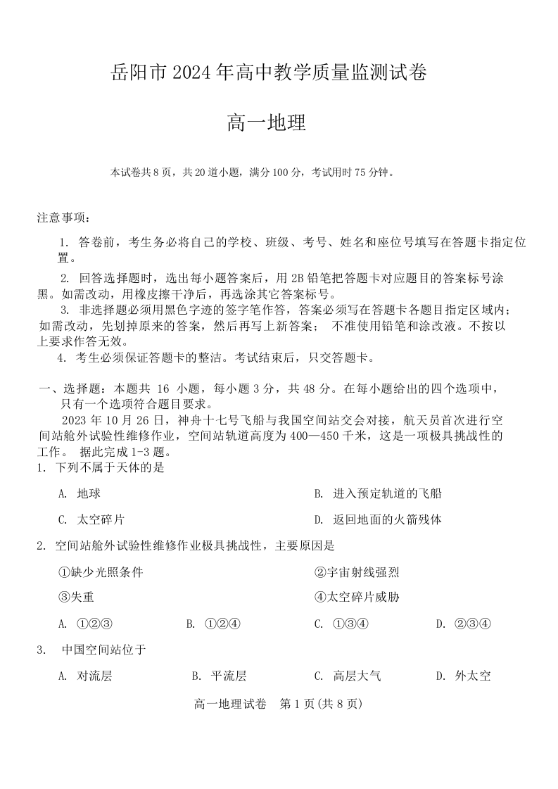 湖南省岳阳市2023-2024学年高一上学期1月期末试题地理