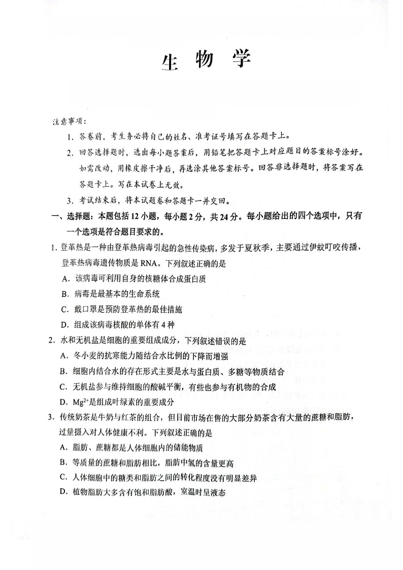 湖南省永州市2024-2025学年上学期1月高一期末质量检测生物+答案