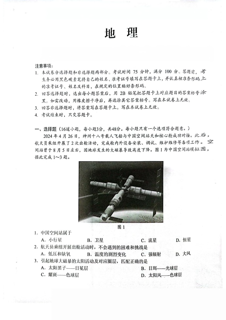 湖南省永州市2024-2025学年上学期1月高一期末质量检测地理+答案