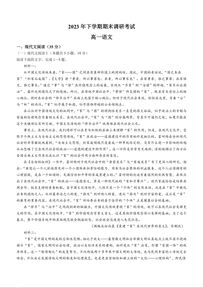 湖南省长沙市宁乡市2023-2024学年高一上学期期末考试语文