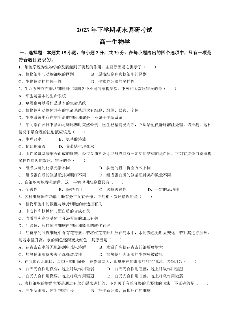 湖南省长沙市宁乡市2023-2024学年高一上学期期末考试生物