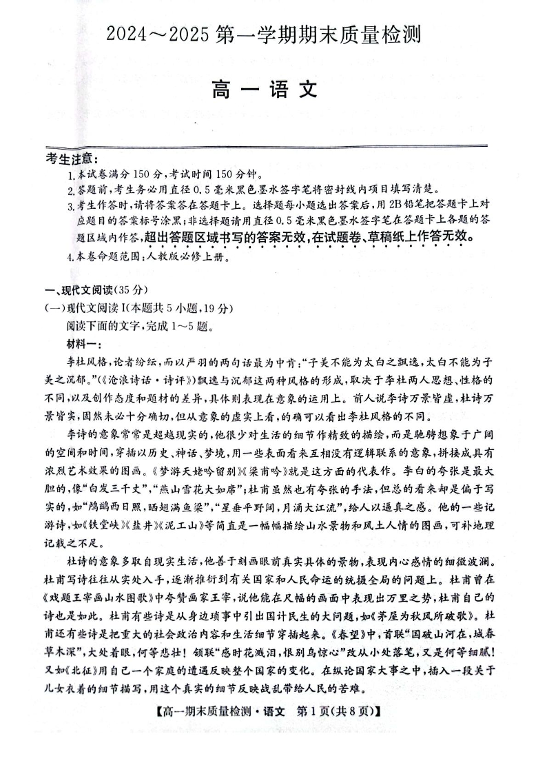陕西省榆林市八校联考2024-2025学年上学期1月高一期末考试语文+答案