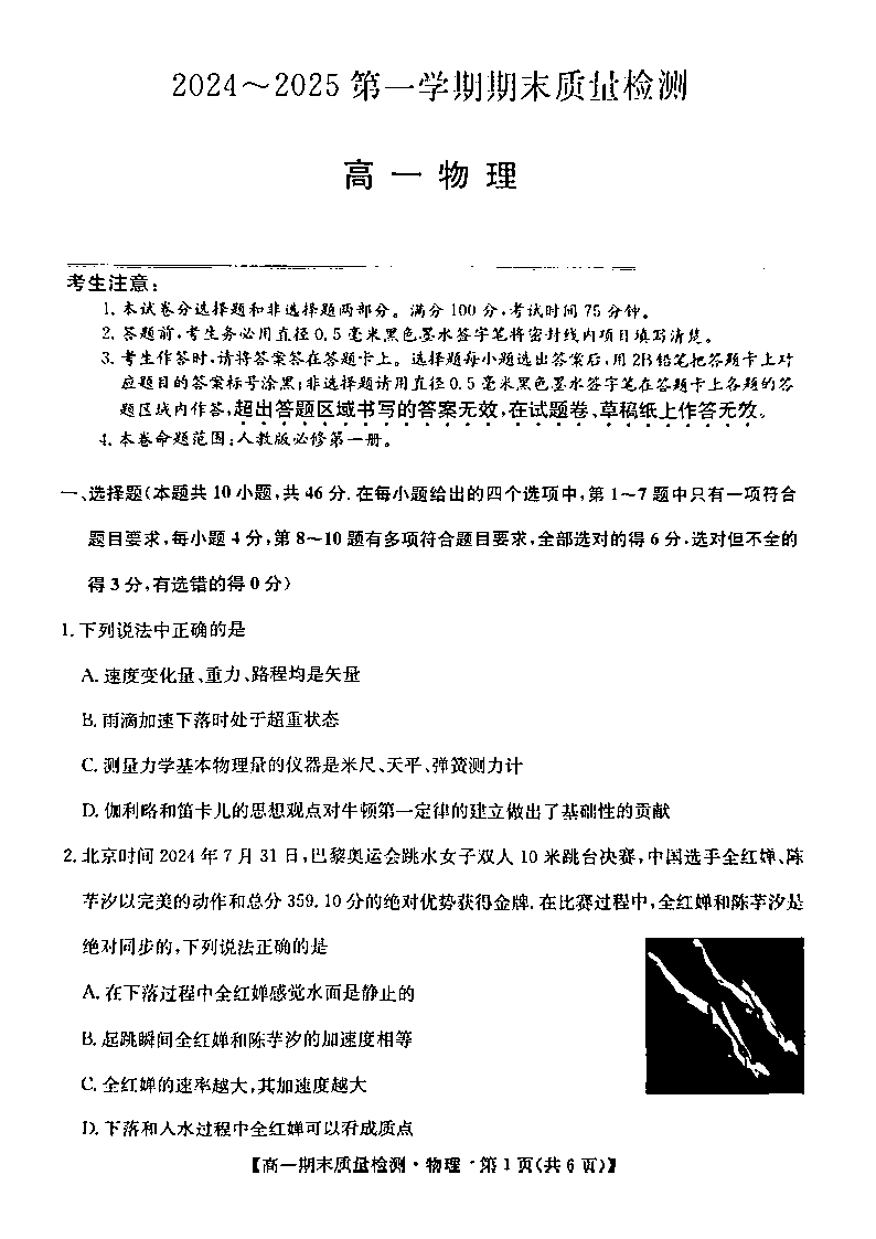 陕西省榆林市八校联考2024-2025学年上学期1月高一期末考试物理+答案