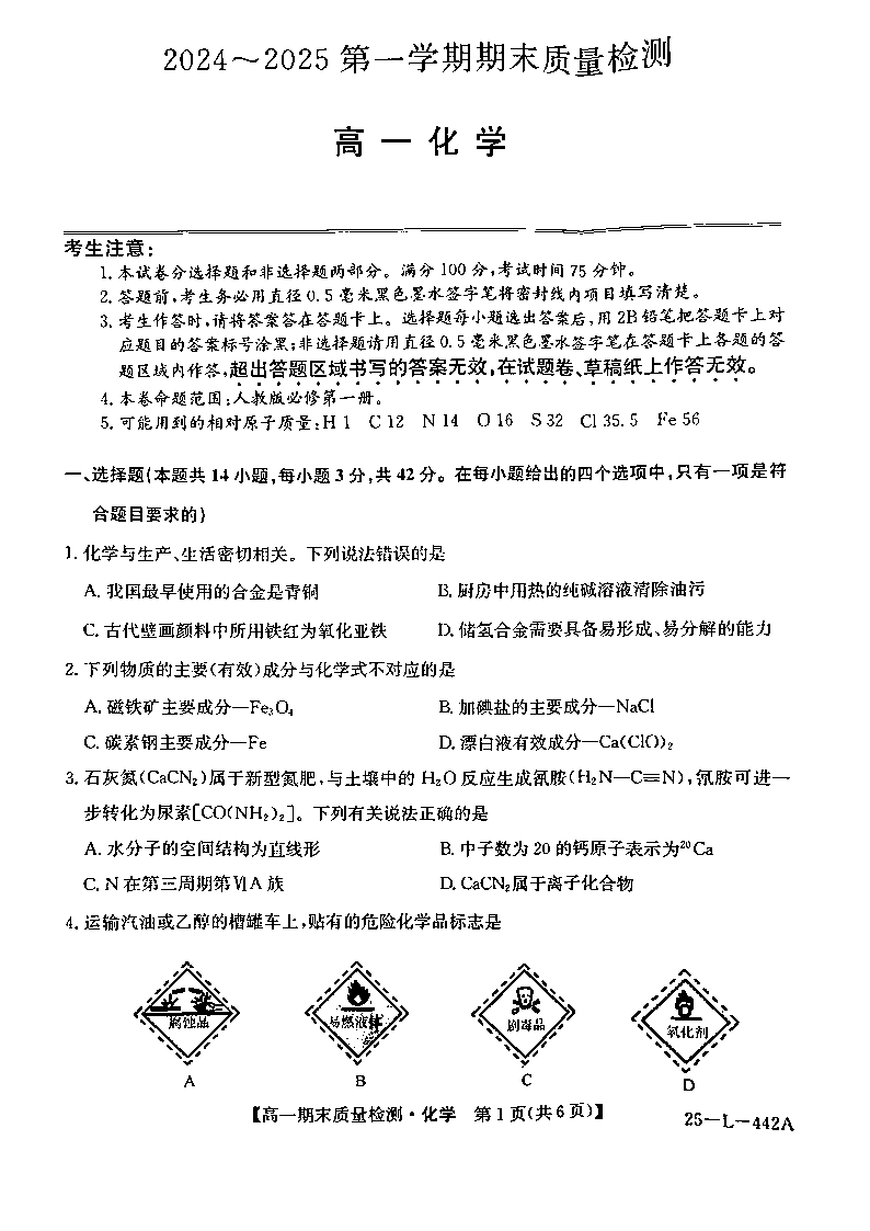 陕西省榆林市八校联考2024-2025学年上学期1月高一期末考试化学+答案