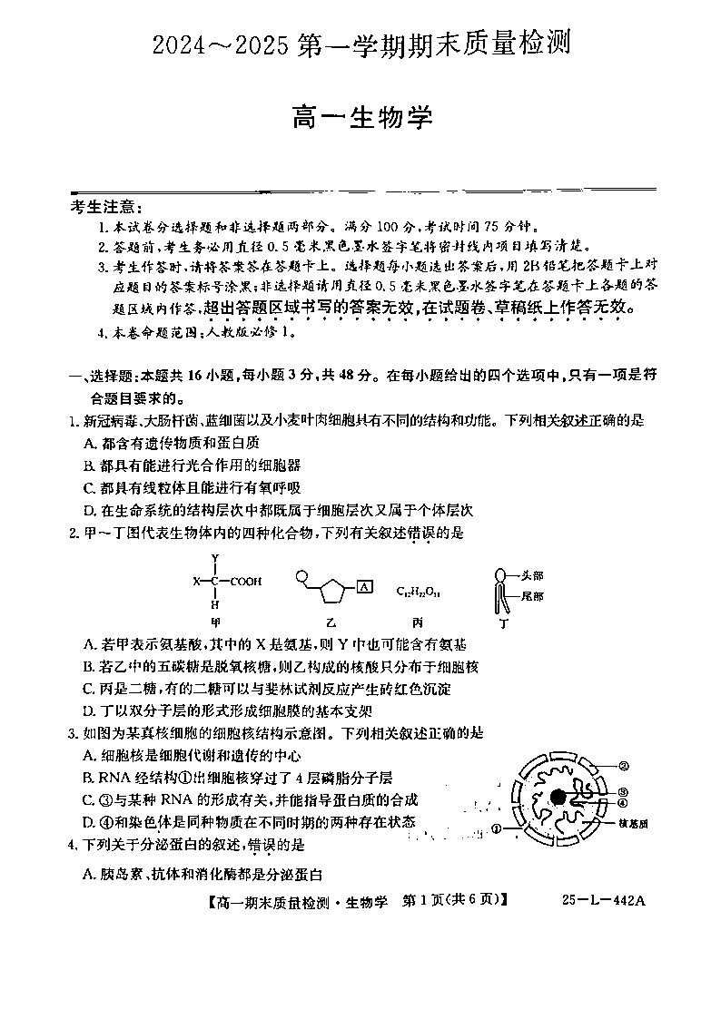 陕西省榆林市八校联考2024-2025学年上学期1月高一期末考试生物+答案