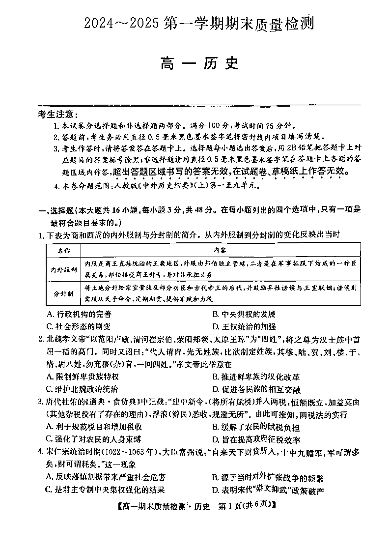 陕西省榆林市八校联考2024-2025学年上学期1月高一期末考试历史+答案