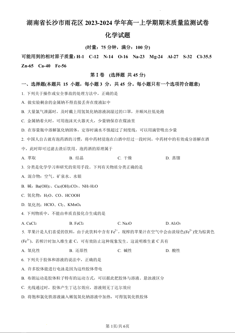 湖南省长沙市雨花区2023-2024学年高一上学期期末考试化学(原卷版)
