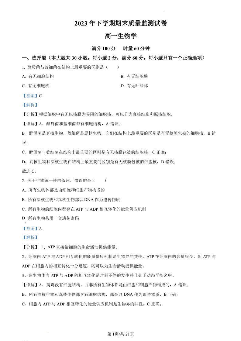 湖南省长沙市雨花区2023-2024学年高一上学期期末考试生物(精品解析版)