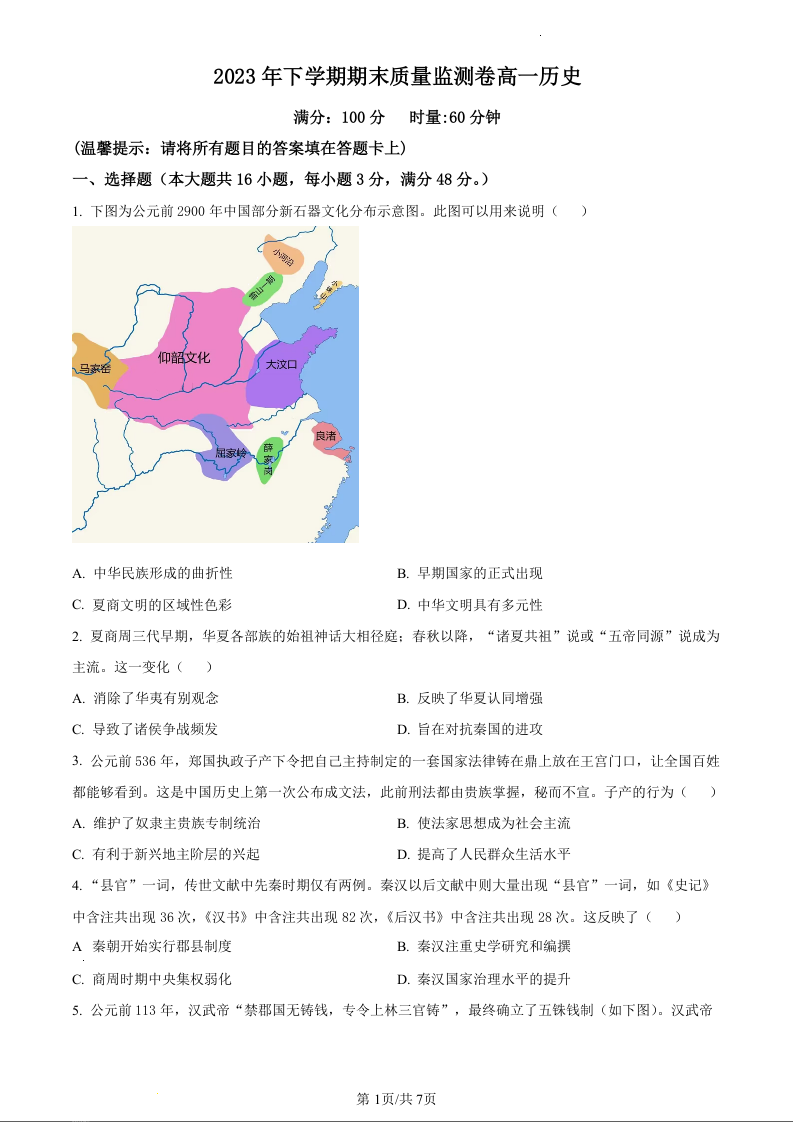 湖南省长沙市雨花区2023-2024学年高一上学期期末考试历史(原卷版)