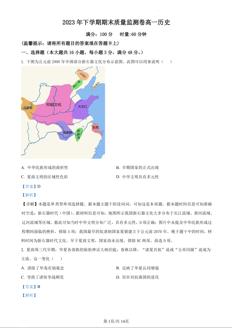 湖南省长沙市雨花区2023-2024学年高一上学期期末考试历史(精品解析版)