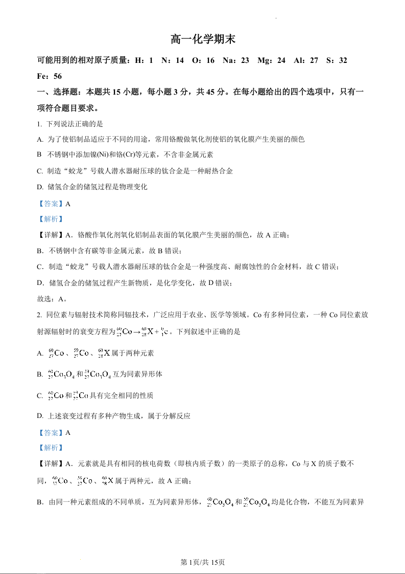 吉林省通化市梅河口市第五中学2023-2024学年高一上学期1月期末考试化学(精品解析版)